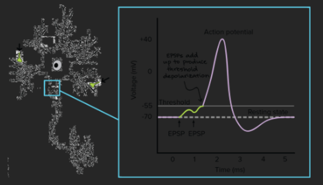 O primeiro paralelo que podemos estabelecer entre o cérebro humano e os computadores está no fato de que ambos operam com sinais elétricos. No cérebro, esses sinais se propagam através de potenciais elétricos que percorrem os dendritos, as “antenas” que recebem informações de outros neurônios. Quando a soma dessas entradas atinge um certo limiar, o neurônio dispara um pulso elétrico chamado potencial de ação (Action potential).