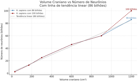 O gráfico abaixo mostra o comparativo evolutivo entre as duas estimativas de neurônios. Ele traça a relação entre o volume craniano ao longo de milhões de anos e a posição do Homo sapiens.